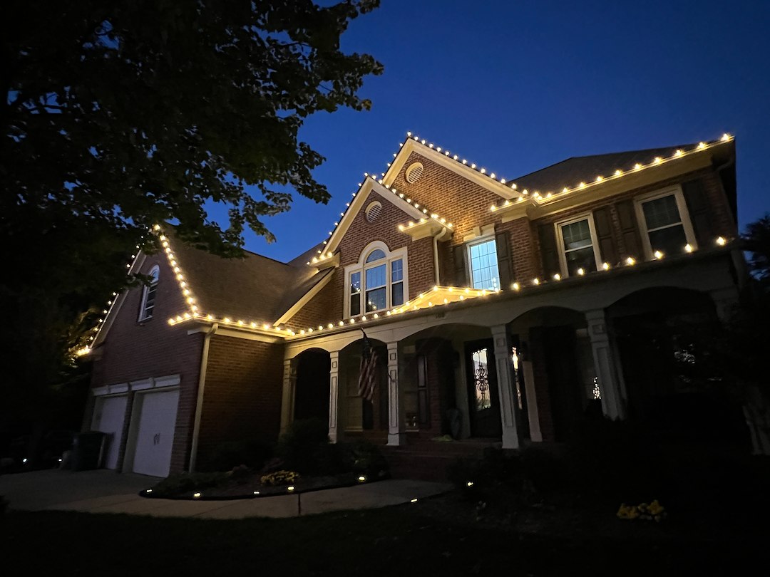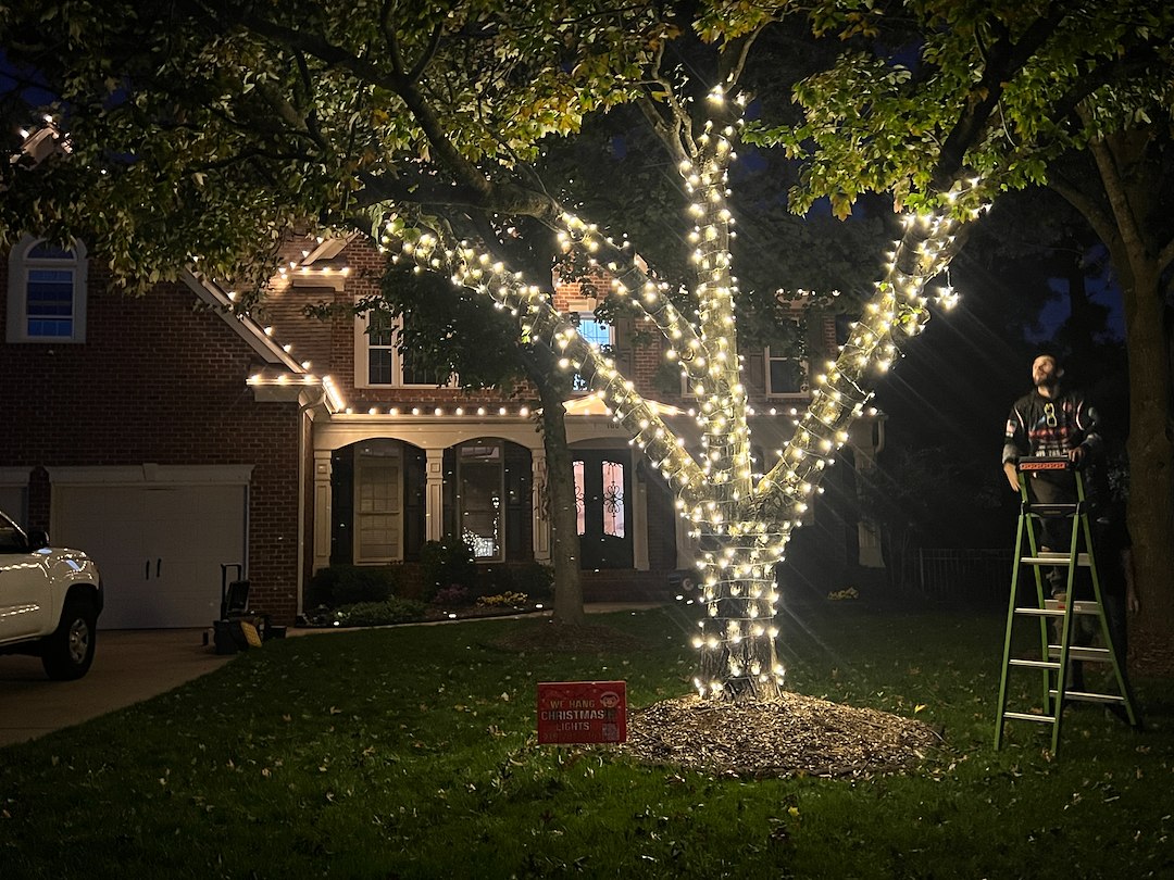 The holidays are upon us! Take a look at this Holiday Lighting Installation we completed in Cary, NC last week! Our Christmas Lighting installs include wiring custom cut to fit your home or business along with commercial grade LED C9 lights. This customer went with Warm White Bulbs, but we can also install multi-colored bulbs. We finished up with a tree wrap using 5mm Mini Light strands. The end result is a beautifully lit home sure to bring the family home for the holidays!