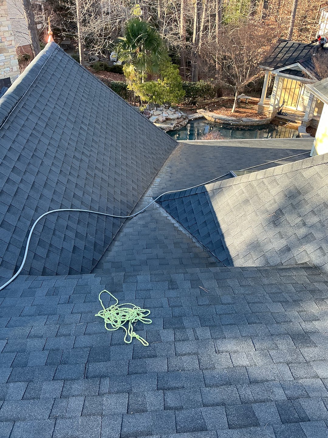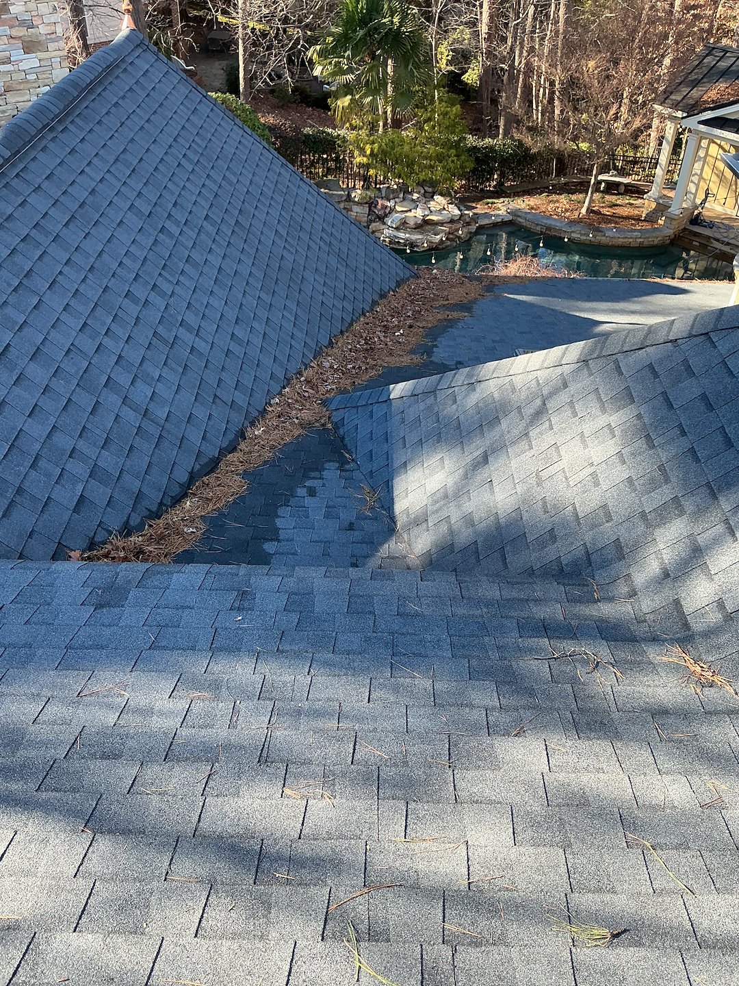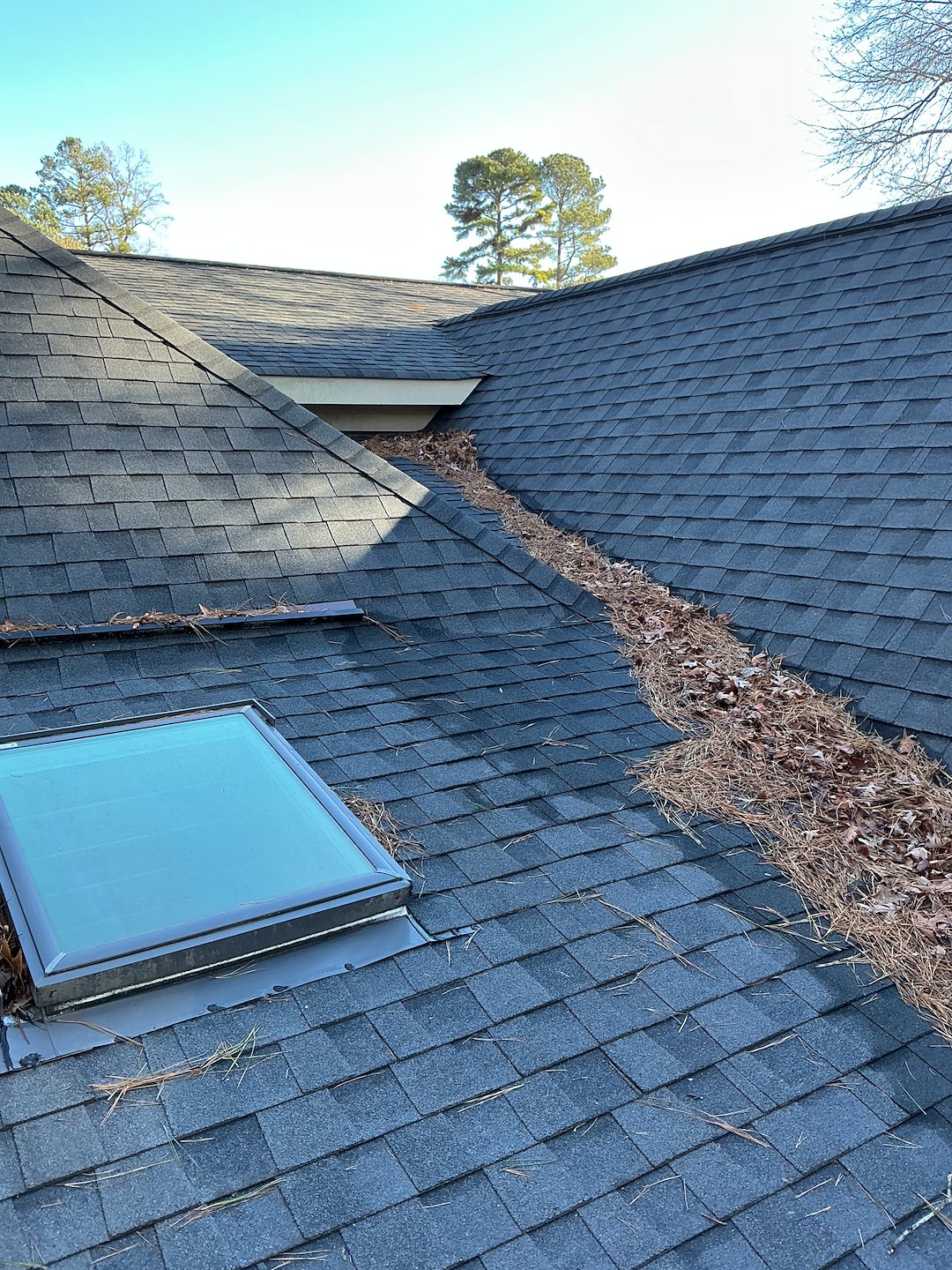 For this gutter cleaning in Cary, NC, we needed to clear the gutters of leaves and pine needles as well as blow the collected debris from the roof. As seen in the photos, the leaves and pine needles had collected in many areas. If left undisturbed, the debris on this roof would not wash away with the rain, but would simply continue to collect due to the low pitch and architectural design of the roof.