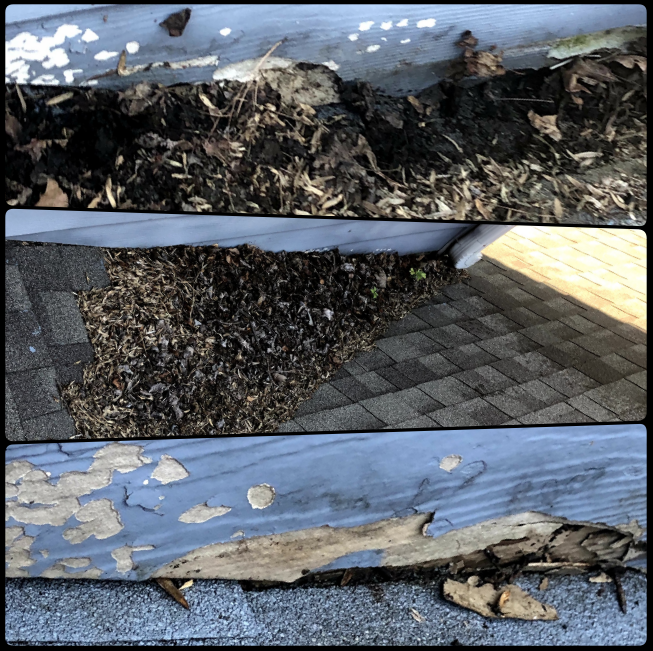 This creates a problem because as this debris begins to decay over time it also decays the siding, window seals, and shingles. (Take a look at the last photo for an example of this happening at a different location we cleaned years ago.) This is a point of concern for homeowners since insurance companies view this as neglect of the homeowner with the possibility of facing insurance cancellation and/or denial of claims associated with damage stemming from the sitting debris.