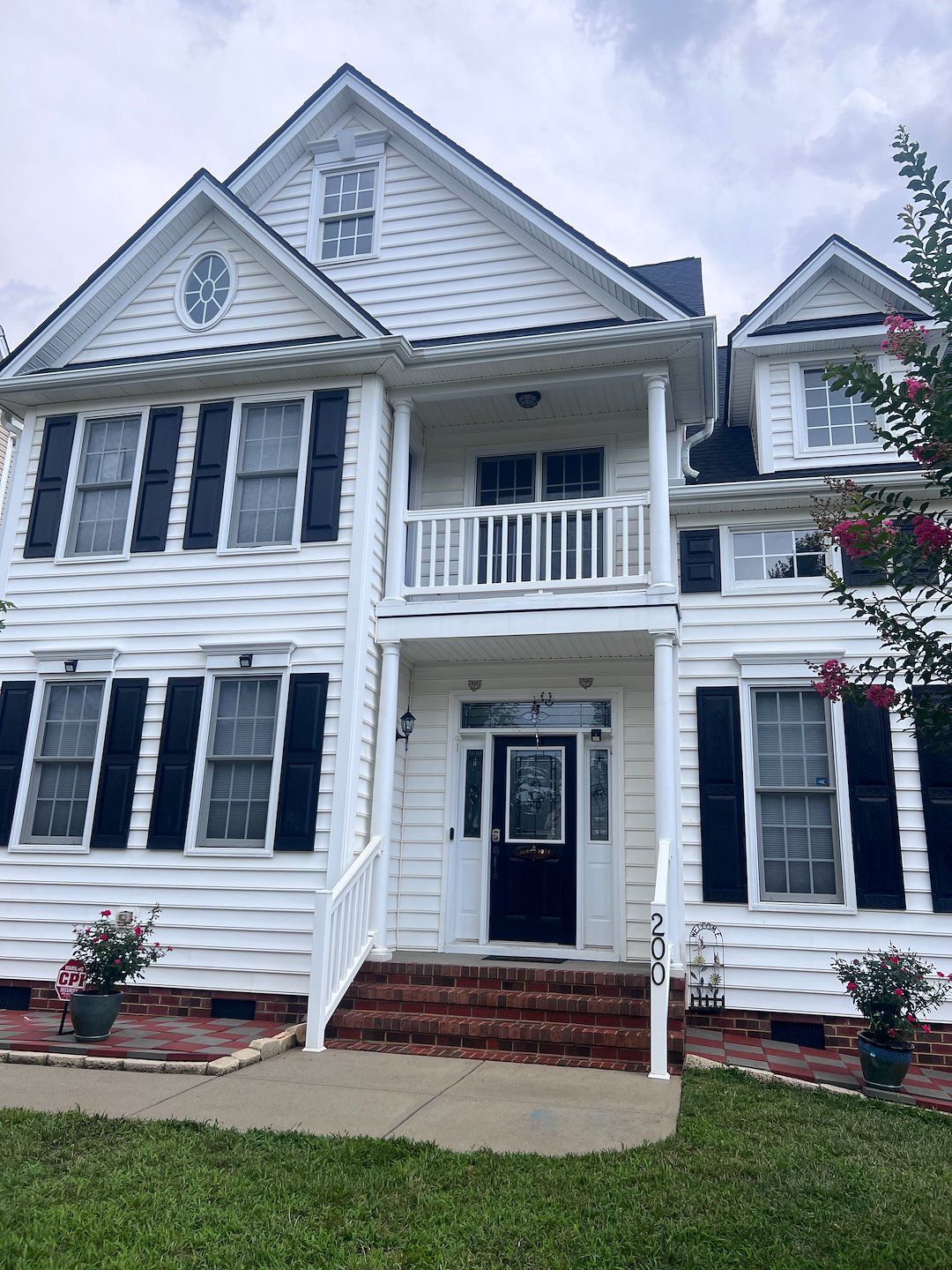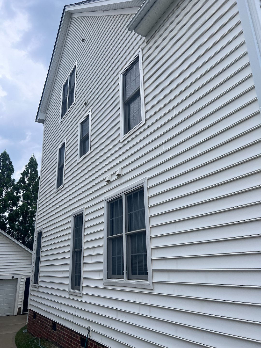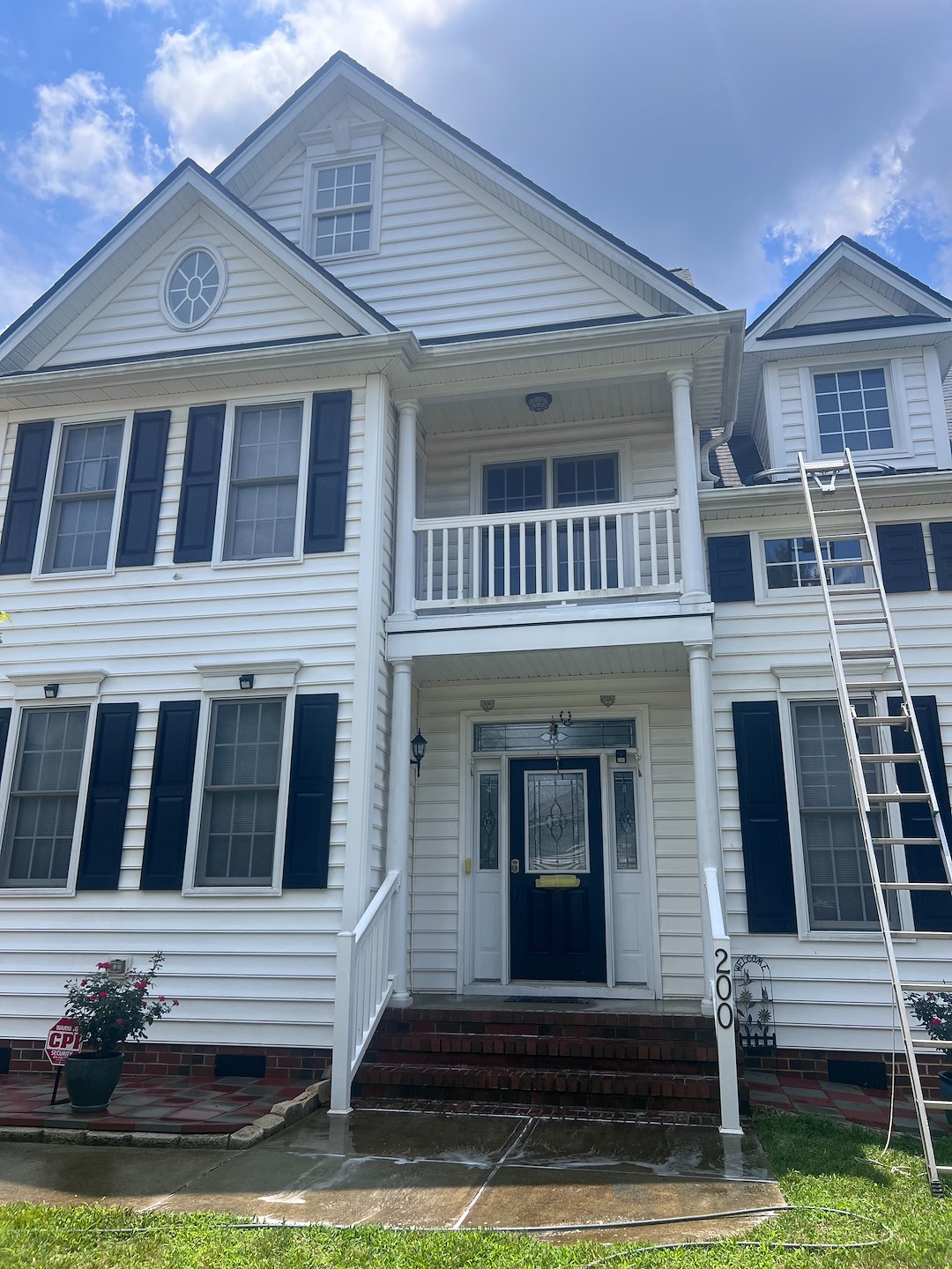 We recently power washed this house in Morrisville, NC. Some companies call this pressure washing, but we prefer to not call house washing a high-pressure job. For this house wash, we used our low pressure cleaning method that does a beautiful job without blasting the siding or causing damage. With our professional power washing equipment, we are able to reach those 3rd story peaks from the ground without a ladder. We did, however, need to pull out the ladder to clean the 2nd story porch seen on the front of the home.